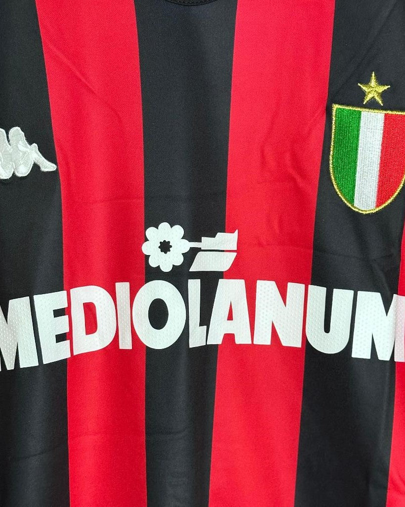 Rivivi l'epoca d'oro del calcio italiano con la maglia del Milan della stagione 1988-89 indossata con il numero 9 da MARCO VAN BASTEN. Questo autentico pezzo di storia sportiva porta lo scudetto sul petto, testimonianza del dominio nel campionato italiano dei rossoneri trascinati dal fenomenale attaccante olandese