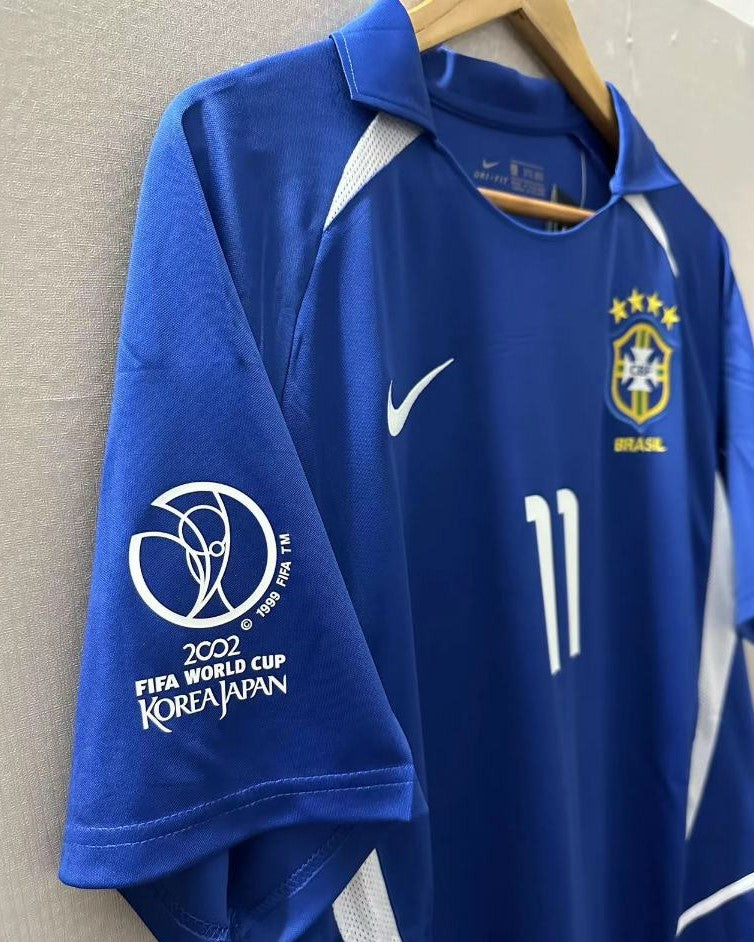 La maglia del Brasile 2002-03 con il numero 11 di RONALDINHO realizzata da Nike, rappresenta una delle più gloriose pagine del calcio brasiliano. La patch sulla manica ricorda infatti la vittoria della Coppa del Mondo in Korea e Giappone, dove il funambolico brasiliano si consacrò come stella assoluta del calcio mondiale