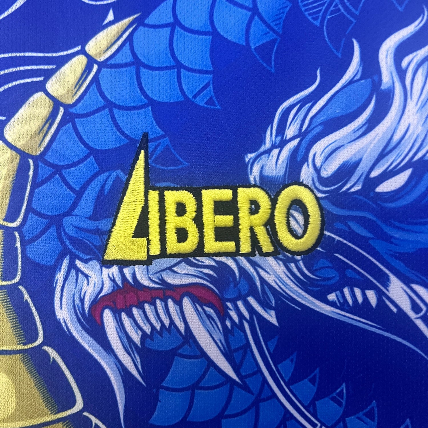 È un design fantasy o custom realizzato da un brand chiamato Libero, noto per creare maglie da calcio dallo stile artistico e alternativo.