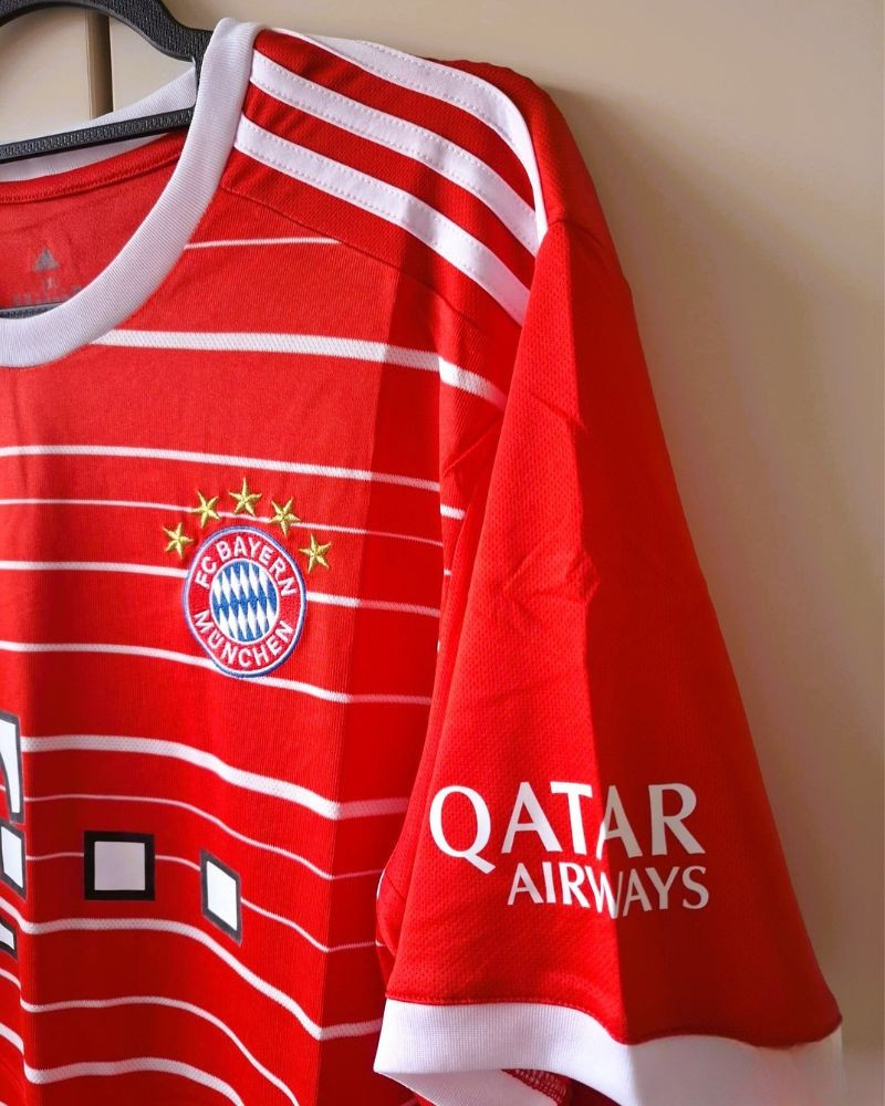 Rivivi la storia del calcio con la maglia del Bayern Monaco della stagione 2022-23 indossata con il numero 25 da THOMAS MULLER. Arricchita dalle patch della Champions League, evidenzia la personalizzazione del fenomenale giocatore tedesco ad elevarne ulteriormente il prestigio