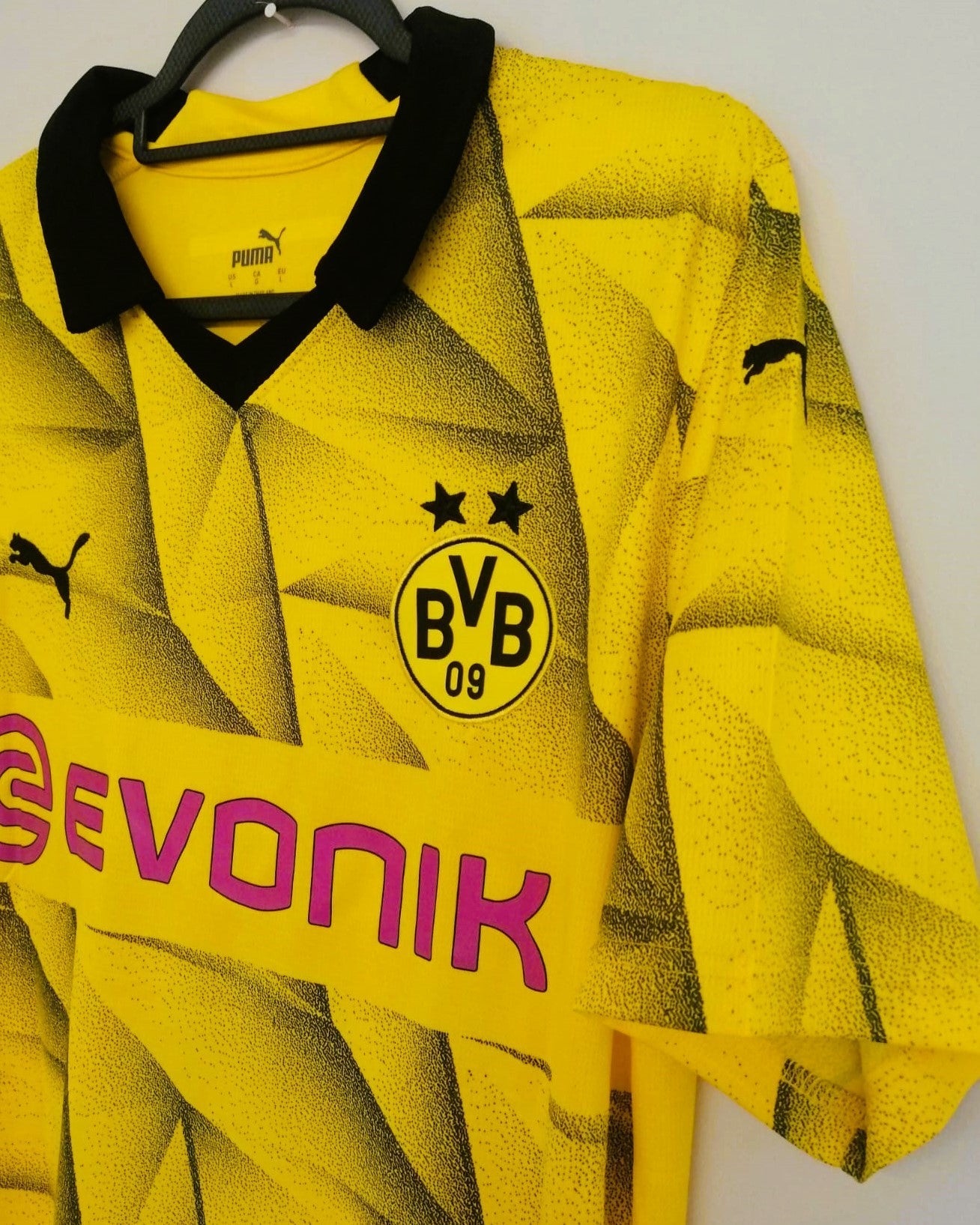 La maglia del Borussia Dortmund con il numero 11 di MARCO REUS del 2023-24 celebra una stagione straordinaria. Le patch della Champions League testimoniano la cavalcata del BVB09 che li ha portati fino alla finale di Wembley, con la personalizzazione dello storico e amatissimo capitano a elevare ulteriormente il prestigio di questa divisa