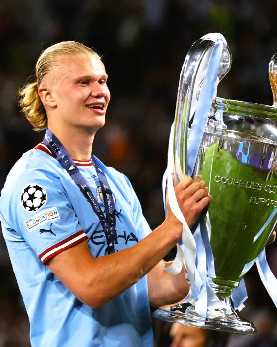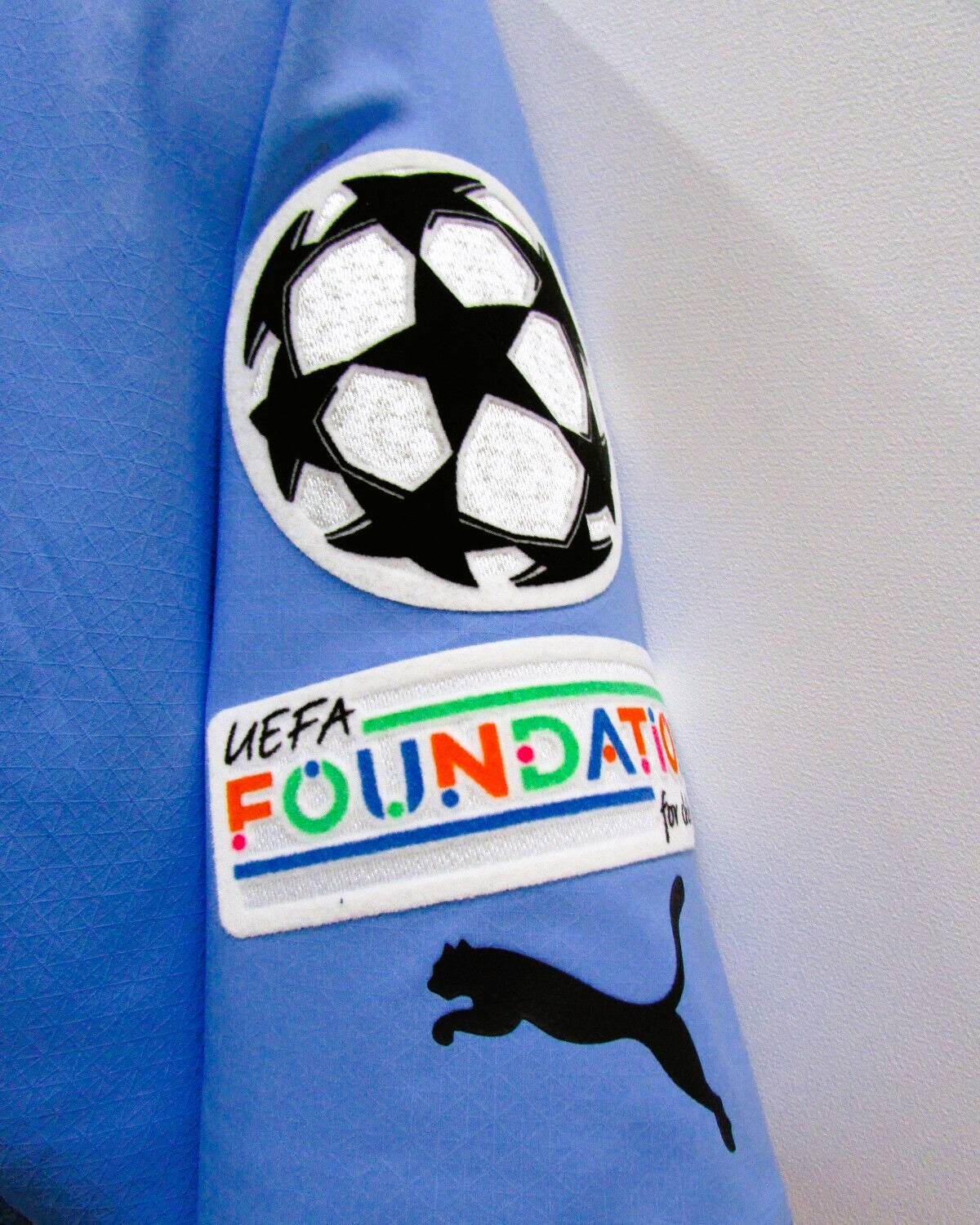 La maglia del Manchester City realizzata nel 2022-23 con il numero 9 di ERLING HAALAND, testimonia la leggenda del calcio. E' la celebrazione del Treble, dei trionfi dei Citizens guidati dal fenomenale attaccante norvegese con le patch della Champions League che ne testimoniano il trionfo europeo