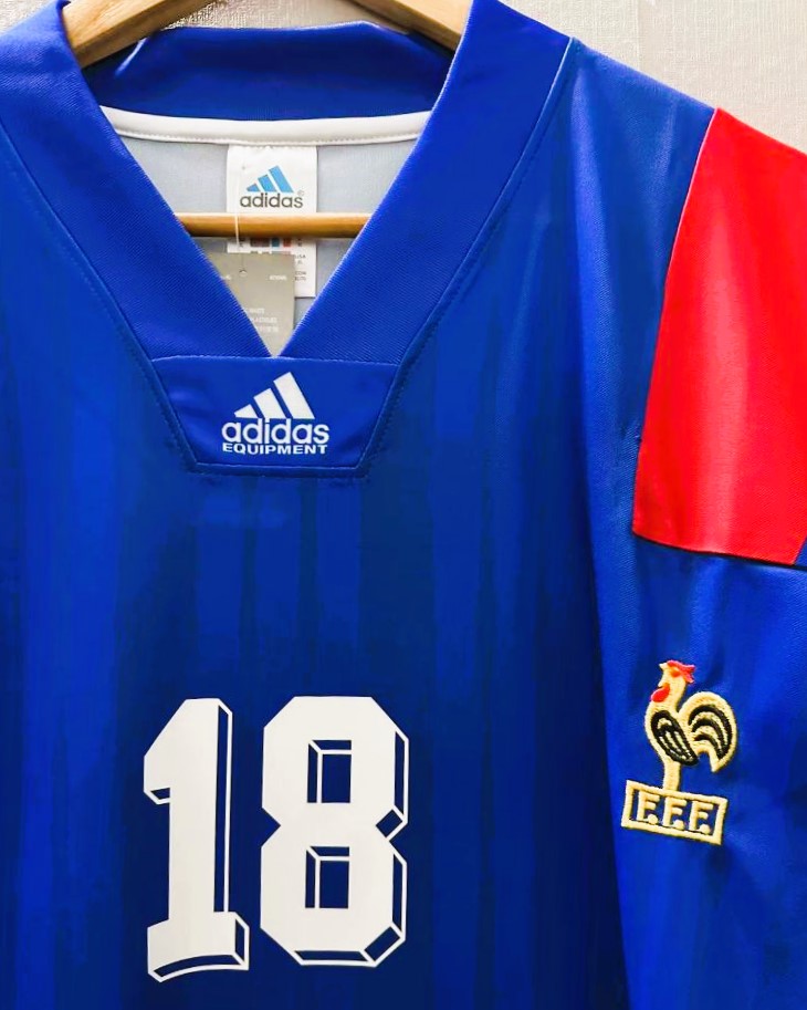 Benvenuti nella pagina della maglia della Francia della stagione 1992-93 con il numero 18 di ERIC CANTONA, Una divisa splendida che evidenzia i colori della bandiera francese e la personalizzazione di King Eric, testimonianza del suo controverso rapporto con la nazionale francese