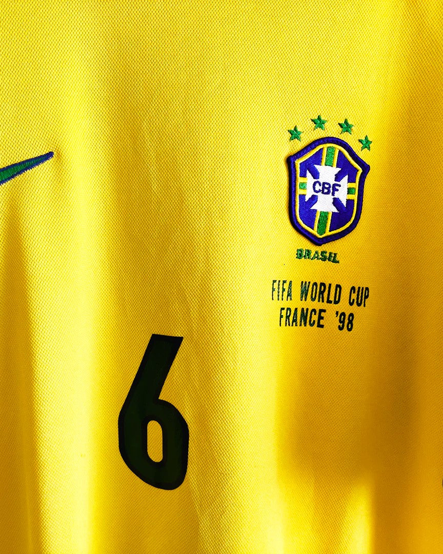 La maglia del Brasile con il numero 6 di ROBERTO CARLOS è un'opera d'arte calcistica della stagione 1998-99. Utilizzata ai mondiali di Francia 98 come testimoniato dalla scritta celebrativa sul petto, evidenzia la grandezza degli oro-verde e del fenomenale terzino brasiliano assoluta leggenda del calcio mondiale