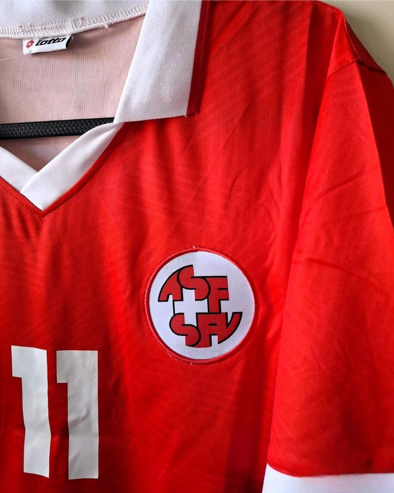 Rivivi la storia della nazionale Svizzera grazie alla maglia numero 11 di STEPHANE CHAPUISAT della stagione 1994-95. Utilizzata nella World Cup Usa '94, evidenzia la personalizzazione del bomber svizzero ad elevarne ulteriormente il prestigio