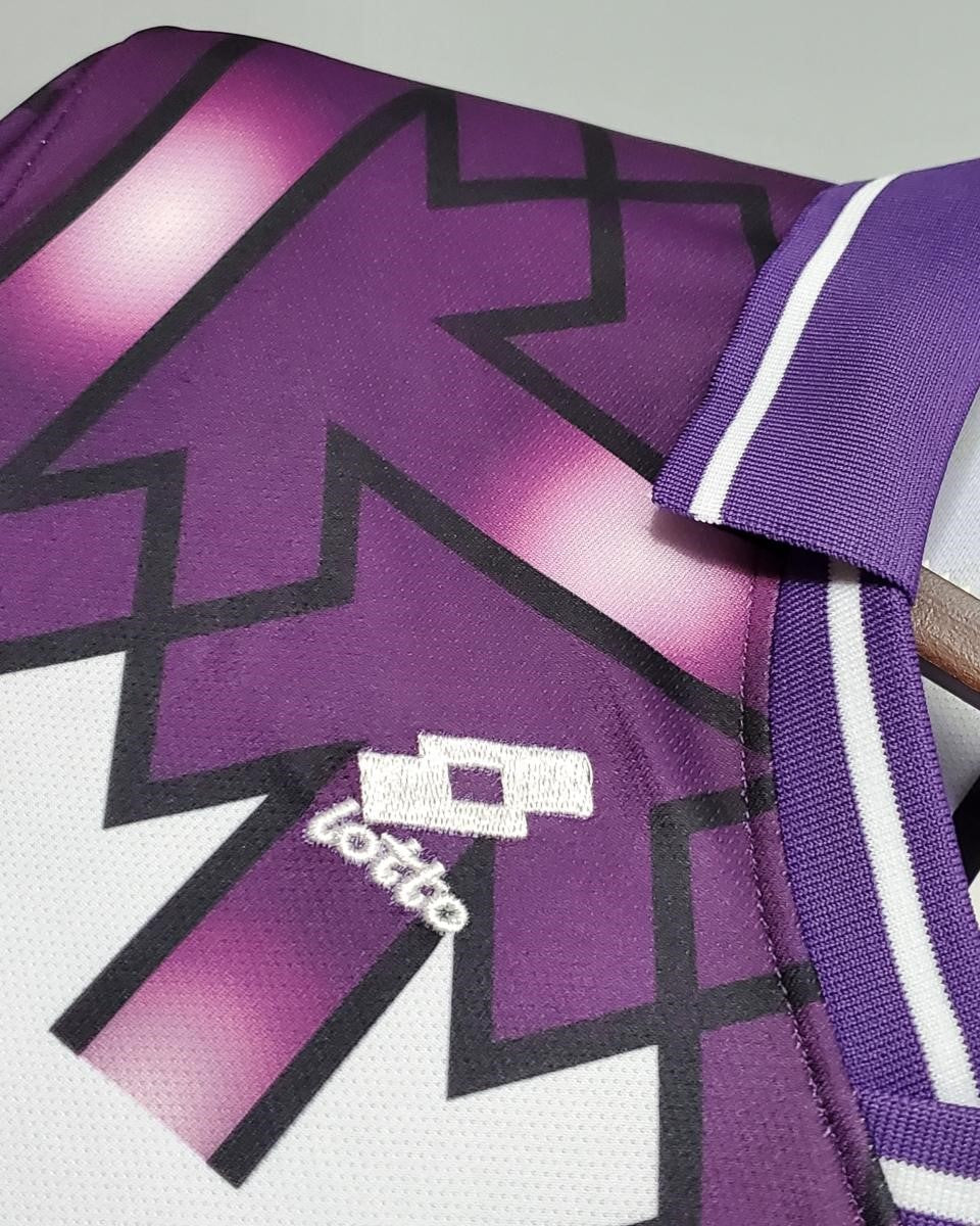 Welcome to the 1992-93 season with the Fiorentina jersey of GABRIEL OMAR BATISTUTA, the phenomenal Argentine number 9 who is a legend in the purple. This version is in its own way one of the most sought-after and controversial jerseys, with the geometric designs (typical of the 1990s) unintentionally drawing swastikas on the purple background and making it (despite being promptly withdrawn from the market at the time) one of the most sought-after ever